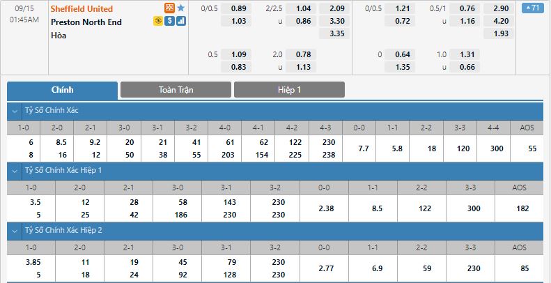 Bảng tỷ lệ kèo bóng đá Sheffield Utd vs Preston