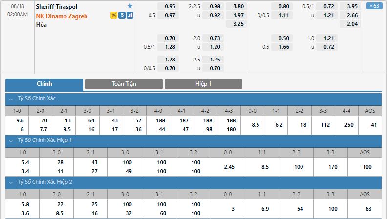 - Kèo tỉ số hiệp 1: Sheriff Tiraspol 0-0 Dinamo Zagreb