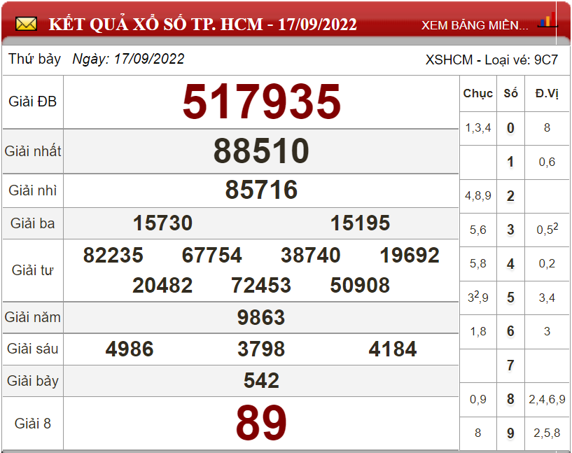 Kết quả lô đề theo xổ số TP.HCM ngày 17/9/2022