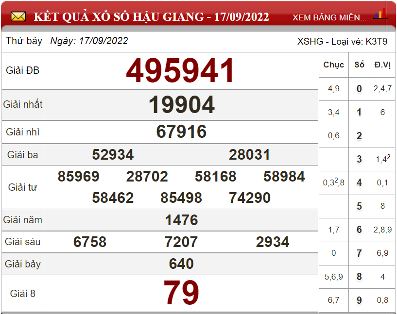 Kết quả lô đề theo xổ số Hậu Giang ngày 17/9/2022