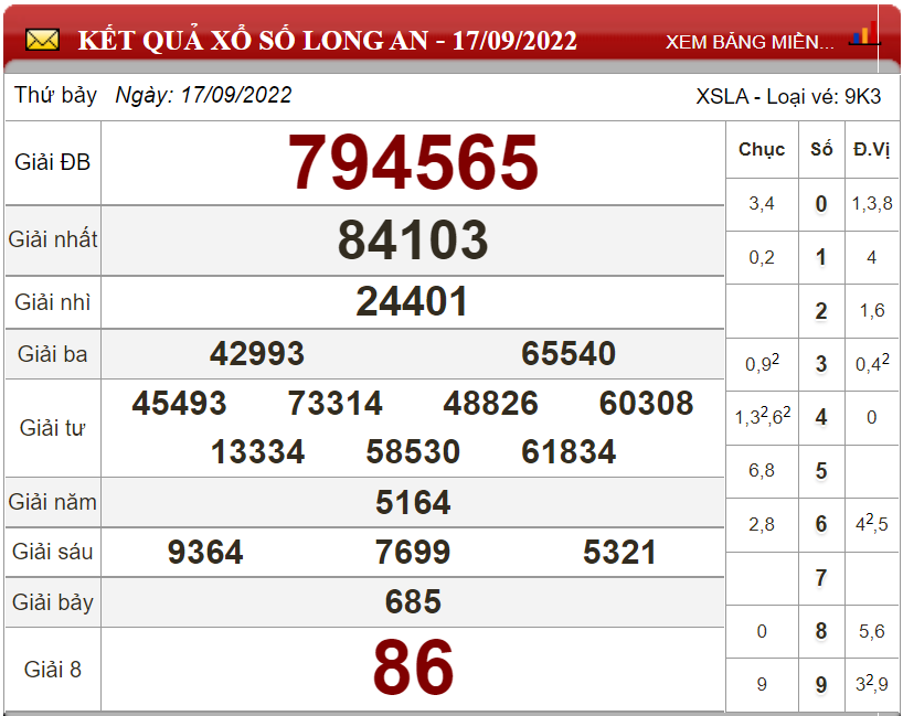 Kết quả lô đề theo xổ số Long An ngày 17/9/2022