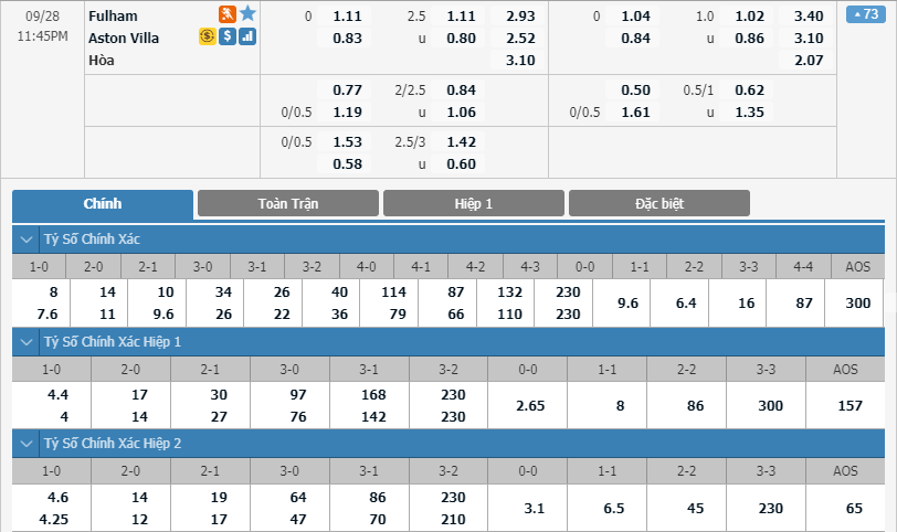 - Kèo tỉ số hiệp 1: Fulham 0-1 Aston Villa