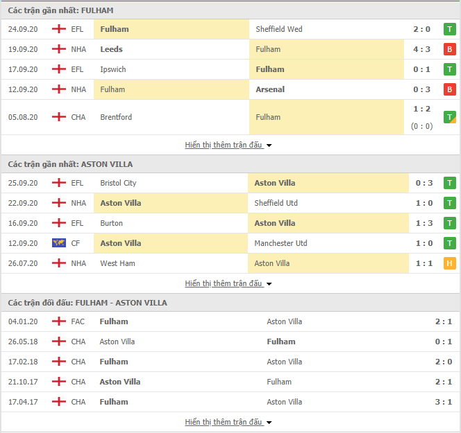 Phong độ gần đây & Thành tích đối đầu Fulham vs Aston Villa