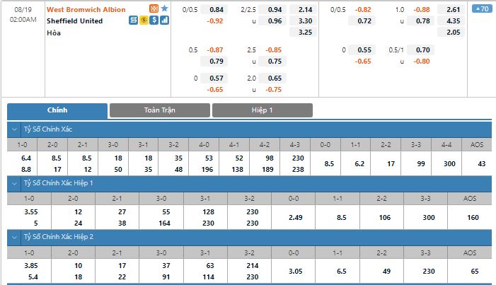 Bảng tỷ lệ kèo trực tuyến trận đấu West Brom vs Sheffield Utd: